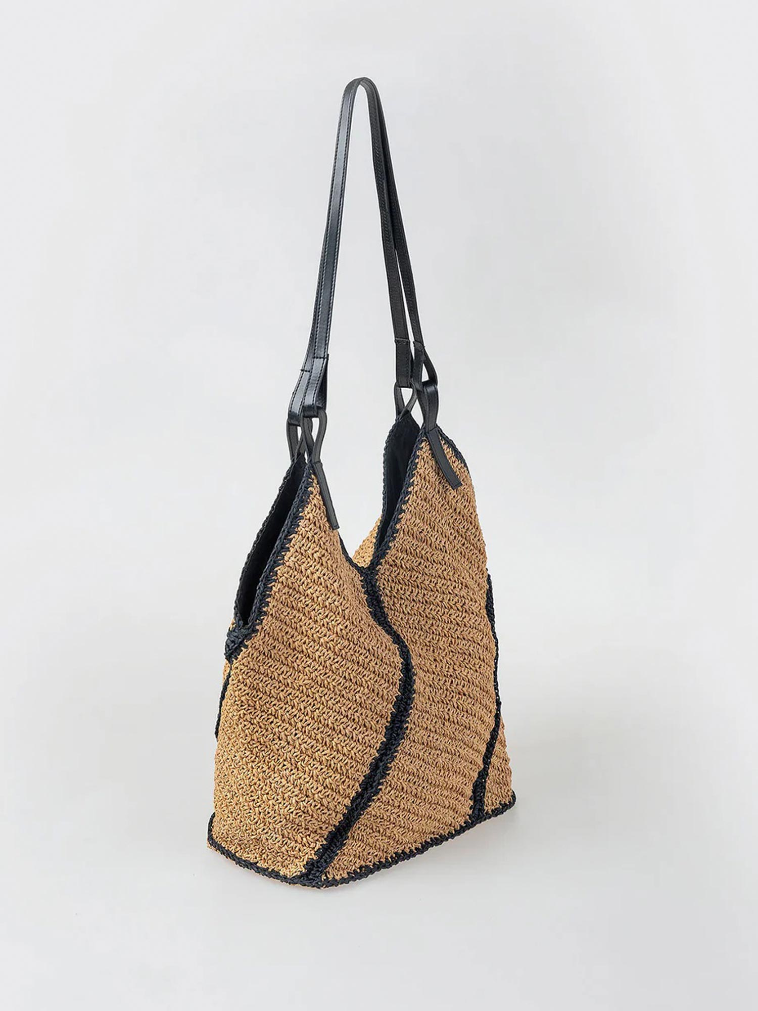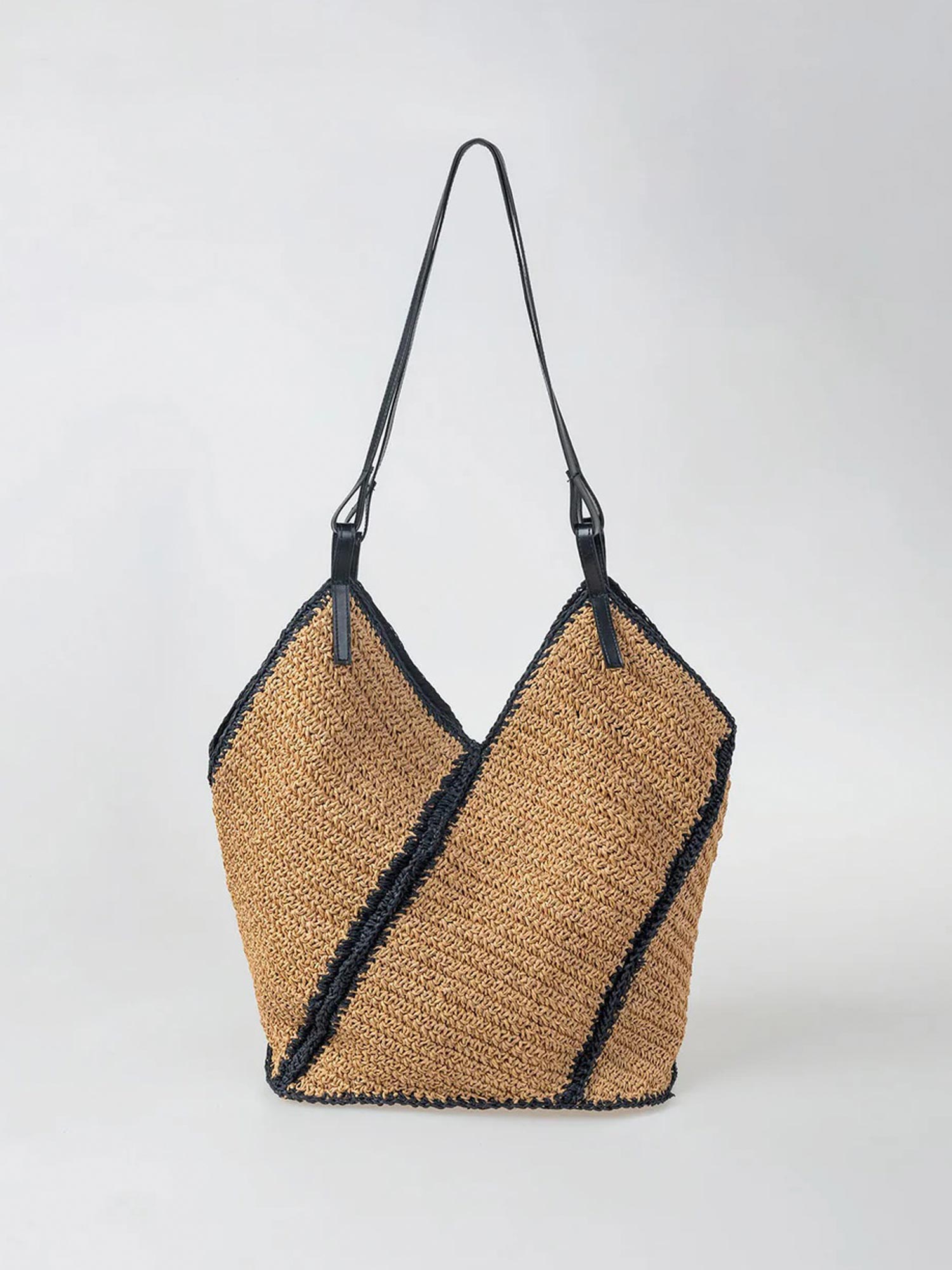 Bolso mediano de yute con detalles a contraste. Asa media.