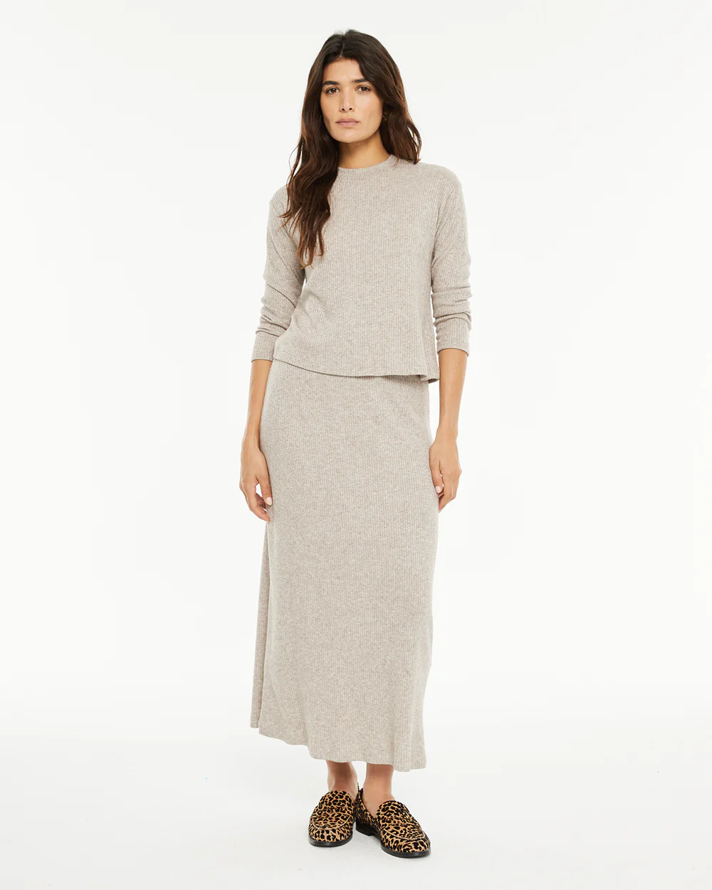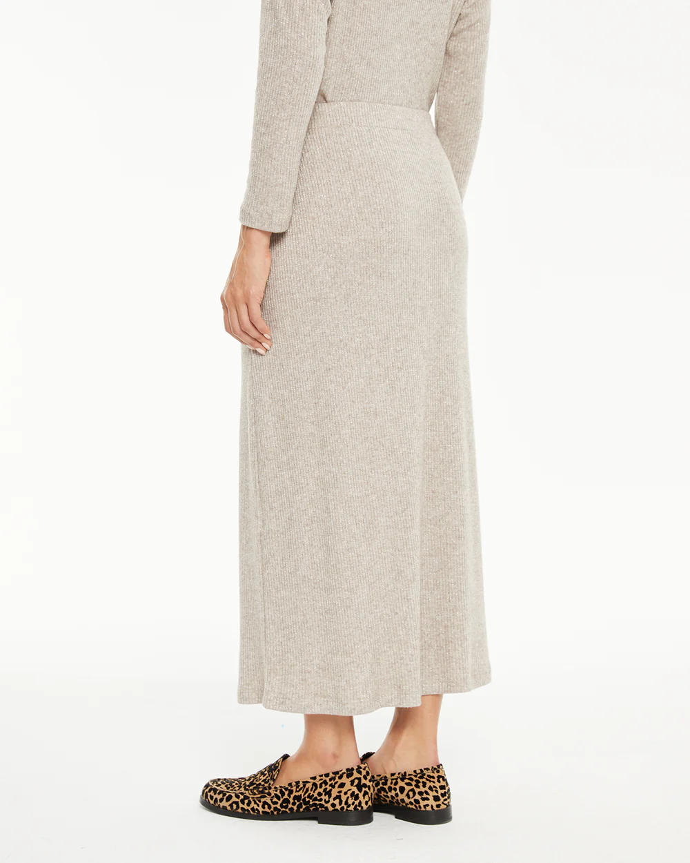 Falda larga de mujer, con goma en la cintura y tejido de canalé con lúrex.