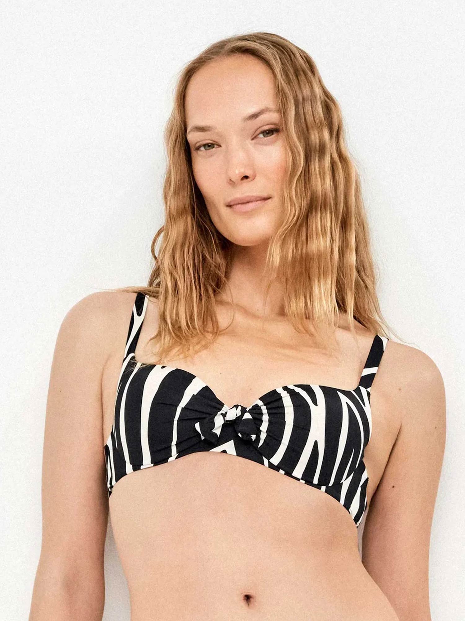 Top bikini capacidad con aro y foam y lazo en escote, estampado animal print cebra.