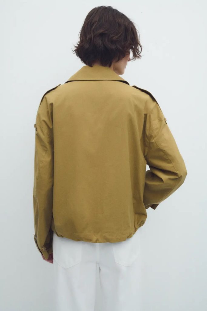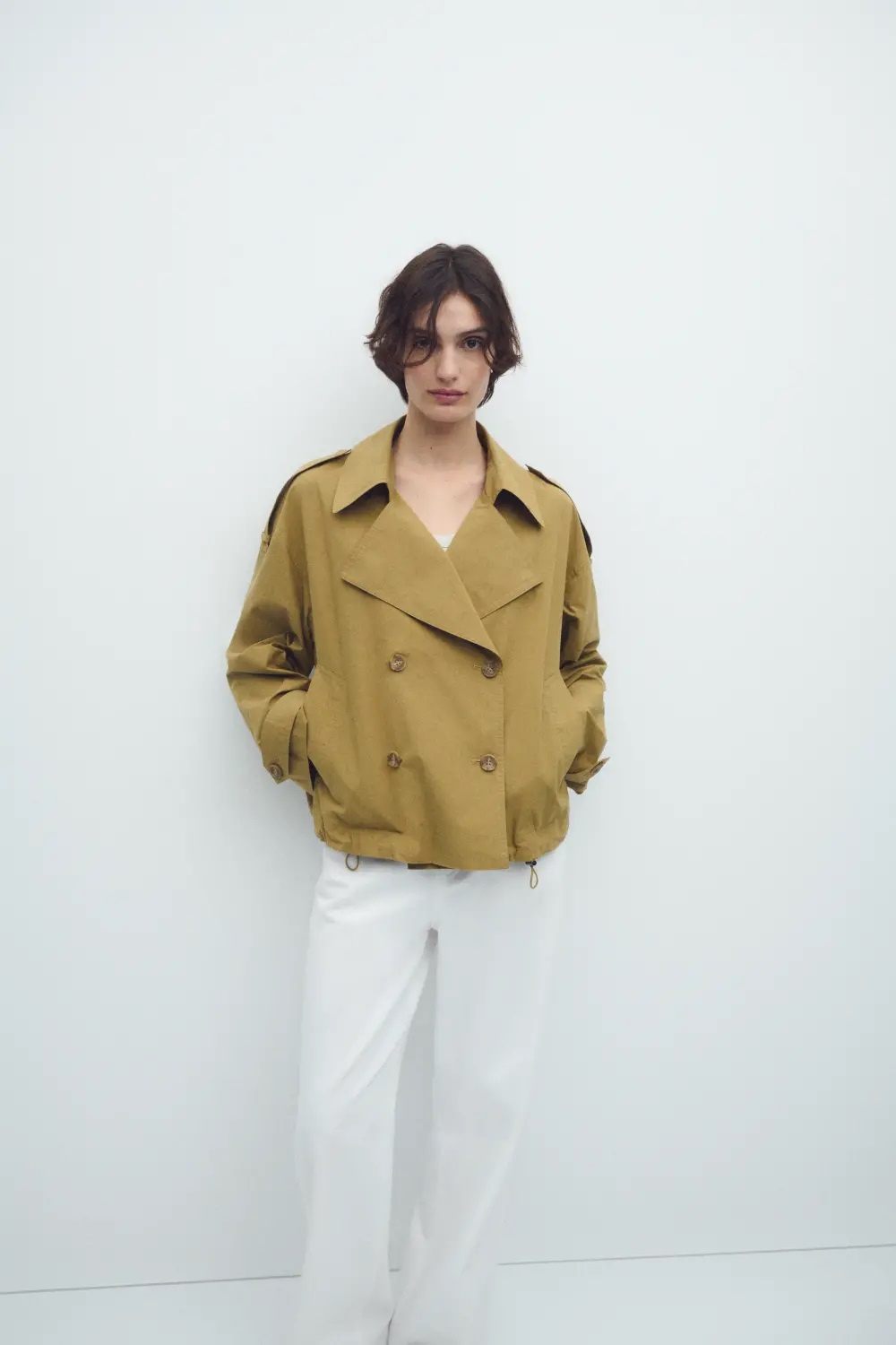 Trench corta de doble abotonadura con cuello solapa.